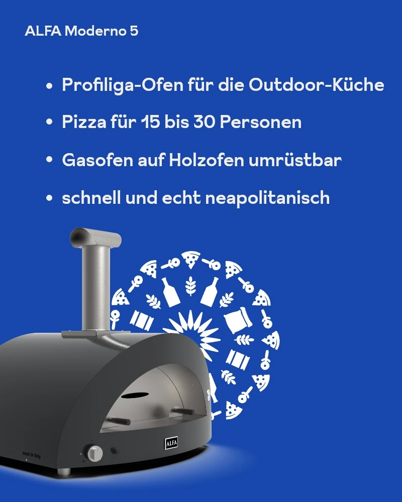Ja, der Moderno 5 Pizze ist speziell für den Outdoor-Einsatz konzipiert. Um ihn vor Witterungseinflüssen zu schützen, empfehlen wir eine passende Schutzhülle.
