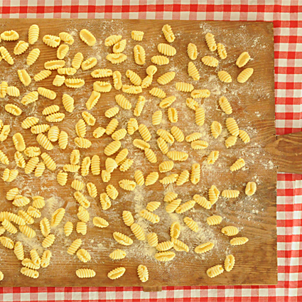 Sollten Sie kein Gnocchibrett zur Verfügung haben, können Sie entweder den Teig zu einem ovalen, flachen Stück formen und ihn in eine Gabel drücken oder der Anleitung für Orecchiette folgen, aber die Nudeln nach dem Ziehen mit dem Messer nicht umstülpen.