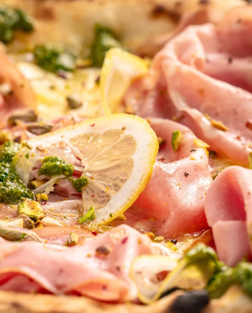 - Schritt 5Die fertige Pizza aus dem Ofen nehmen und sofort mit Mortadella und Zitronenscheiben belegen. Mit gehackten Pistazien und etwas Pistazienpesto verfeinern und servieren.
