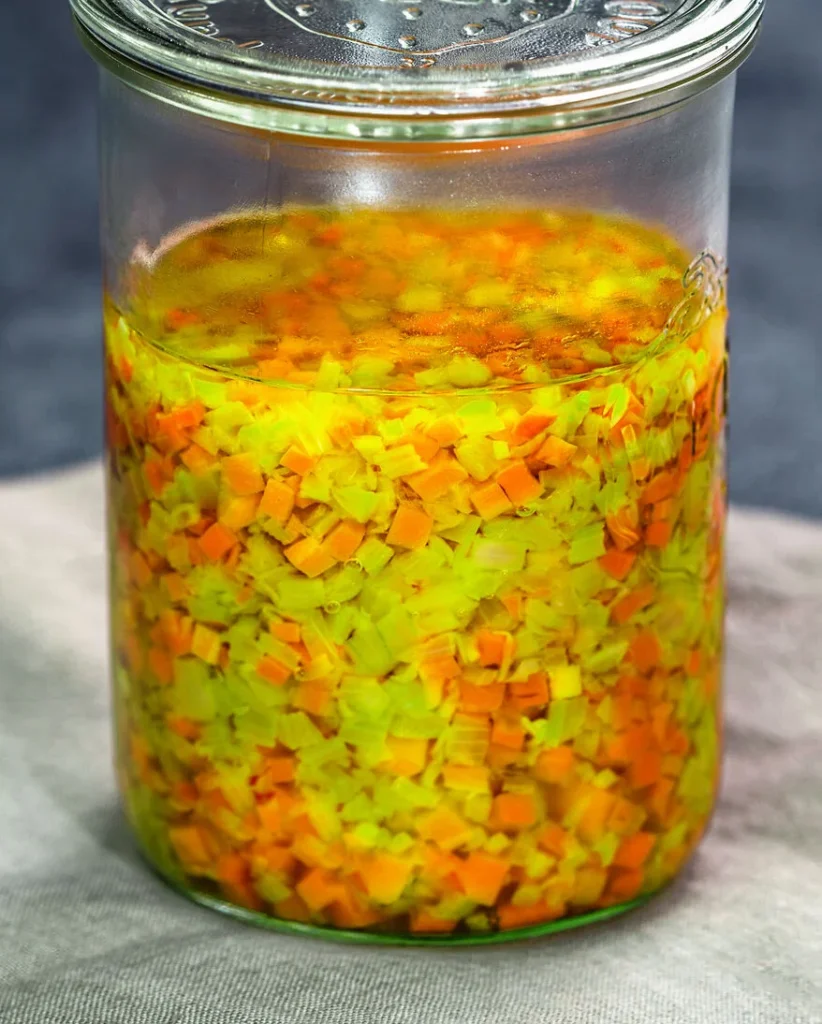 Das fertige Soffritto heiß in ein sauberes Glas füllen, leicht andrücken und vollständig mit dem restlichen Olivenöl bedecken. Gut verschließen und im Kühlschrank aufbewahren. Es ist bis zu zehn Tage haltbar.