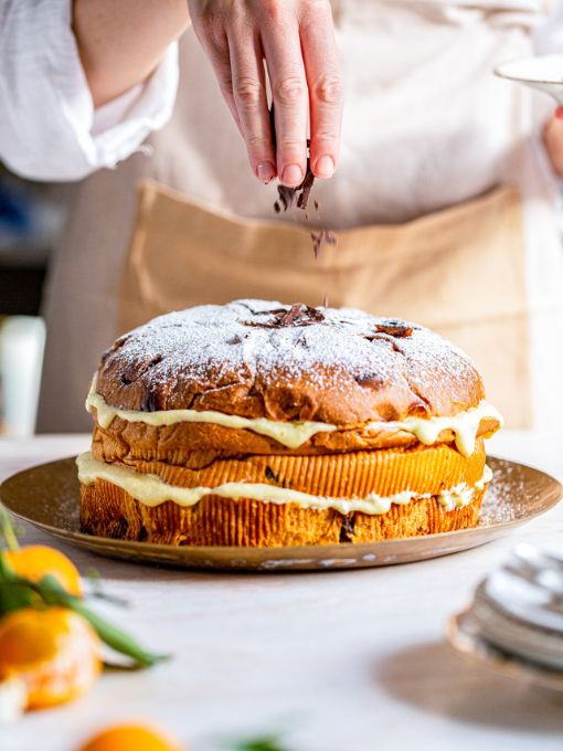- Schritt 8Die Hälfte der Creme und ein Drittel der Schokolade auf dem Boden des Panettone verteilen. Nun das Mittelstück vorsichtig daraufsetzen, mit der anderen Hälfte der Creme bestreichen und mit einem weiteren Drittel der Schokostreusel bestreuen. Zum Schluss den Deckel aufsetzen.