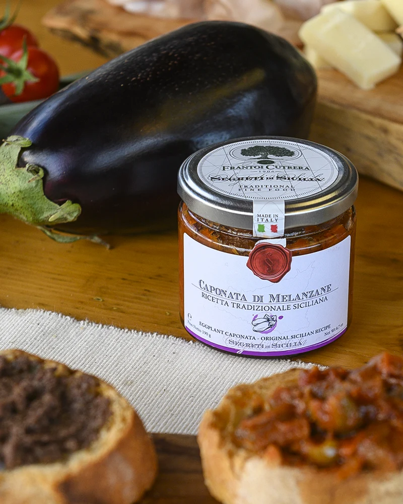 sizilianische Auberginen, Tomatensauce, Karotten, grüne Oliven, Kapern, Sellerie, Zwiebeln, Rohrzucker, Essig, Natives Olivenöl Extra von Frantoi Cutrera, Salz, Basilikum, Oregano.
