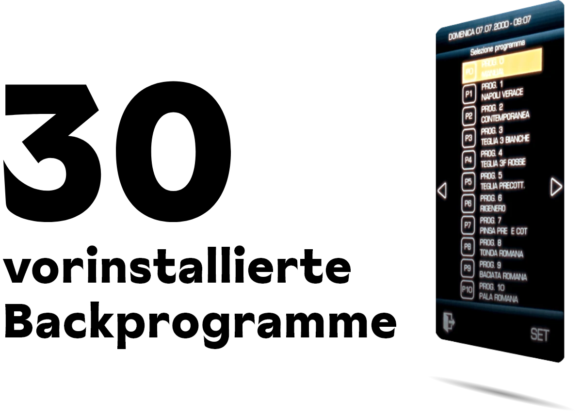 Die digitalen Effeuno-Öfen bieten 30 vorinstallierte Backprogramme, die automatisch Temperatur, Garzeit und Heizleistung anpassen. Damit lassen sich nicht nur verschiedene Pizzaarten, sondern auch Brot, Gebäck oder sogar Panettone optimal zubereiten. Diese Programme erleichtern die Bedienung erheblich und ermöglichen es, verschiedene Rezepte einfach auszuprobieren.