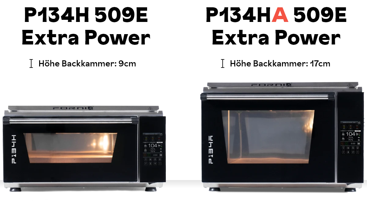 Der P134HA 509E Evolution Extra Power und der P134H 509E Evolution Extra Power unterscheiden sich vor allem in der Höhe der Backkammer. Während der P134HA mit einer großzügigen Backkammer von 17 cm vielseitig einsetzbar ist und sich ideal für Pizza, Brot, Focaccia und andere Backwaren eignet, wurde der P134H mit einer 9 cm hohen Backkammer speziell für die Zubereitung von Pizza optimiert.