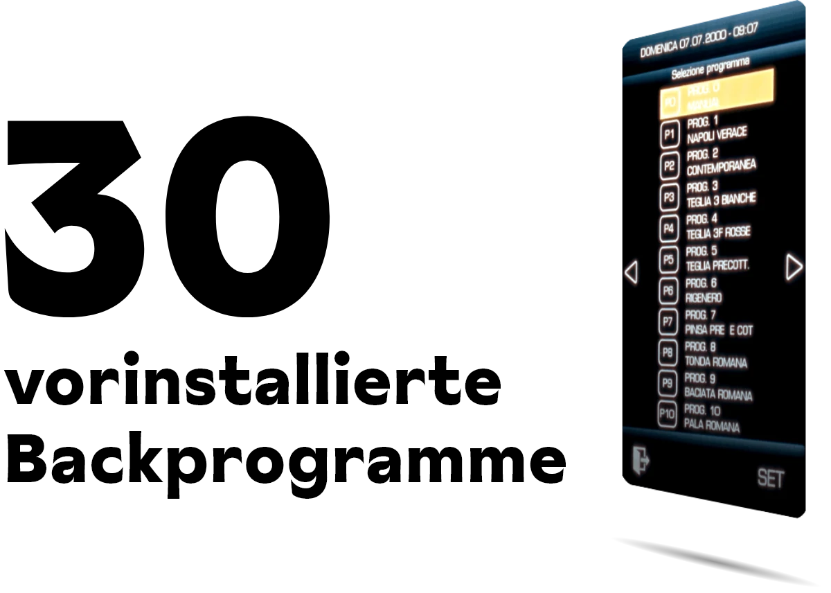 Die digitalen Effeuno-Öfen bieten 30 vorinstallierte Backprogramme, die automatisch Temperatur, Garzeit und Heizleistung anpassen. Diese Programme erleichtern Dir die Bedienung erheblich und ermöglichen es, verschiedene Rezepte optimal zuzubereiten. Es gibt nicht nur Programme für 9 Pizzasorten, Pinsa, Focaccia und Brot, sondern auch welche für süßes Gebäck oder sogar Panettone und Colomba! Auch bei herzhaften Gerichten wie Pasta-Aufläufen bist du dank der perfekt abgestimmten Programme bestens ausgestattet. Besonders genial: das Niedrigtemperatur-Programm (C.B.T.), mit dem Fleisch, Fisch und Gemüse zart und saftig bleiben. Du kannst sogar selbst Programme erstellen. Und wenn es ans Reinigen geht, erledigt die kraftvolle Pyrolysefunktion die lästige Arbeit für dich – einfach einschalten, fertig!