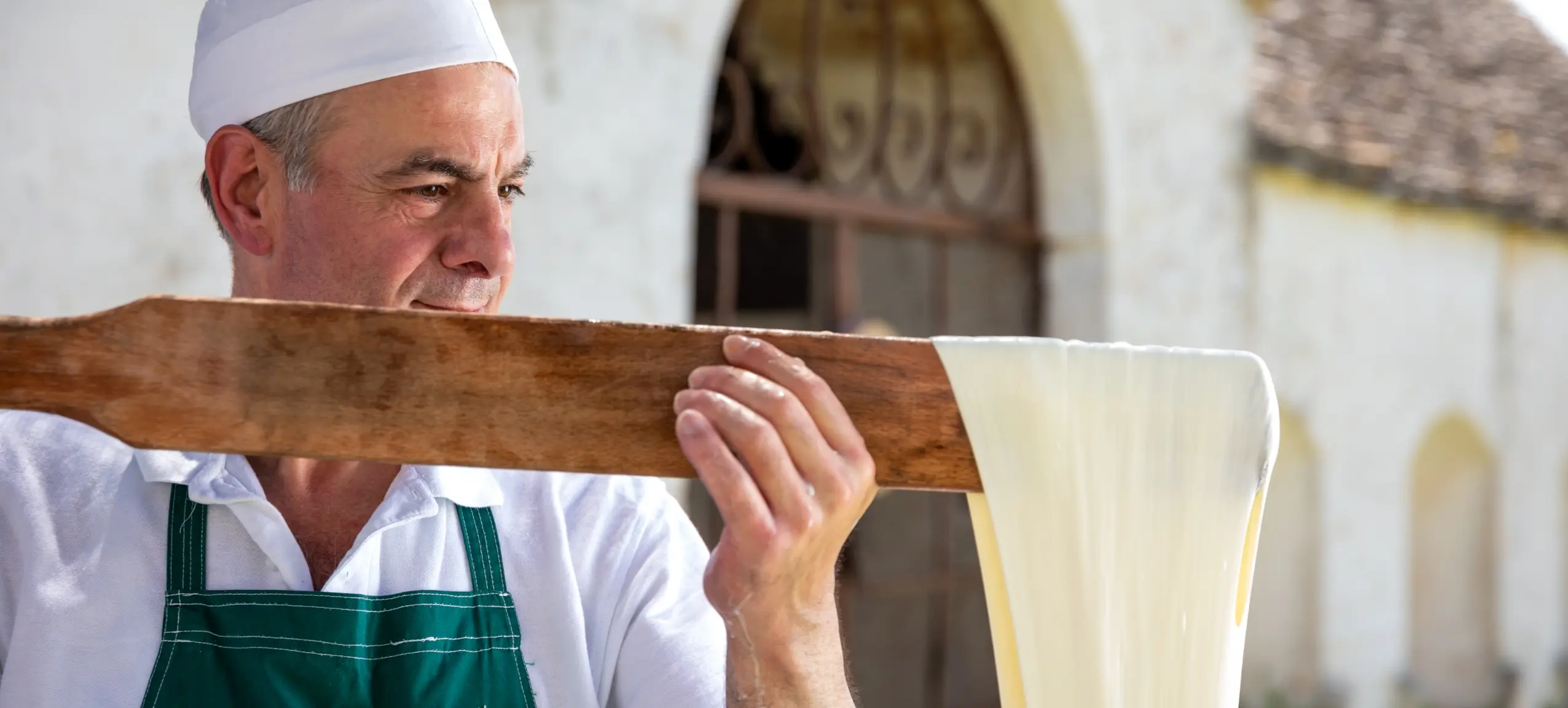 Geschickt hantiert Mario mit Stracciatella, einer Mischung aus Sahne und Mozzarellastreifen, die die Füllung der Burrata ist. Marios Hände stecken im 70°C heißen Wasser. Er knetet und zieht den Teig solange, bis seine Burrataknoten perfekt sind.