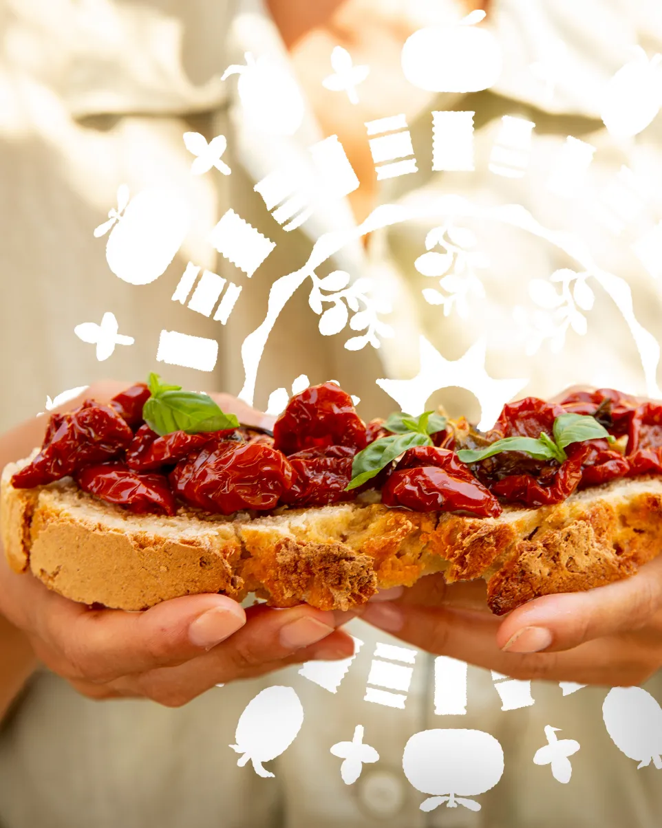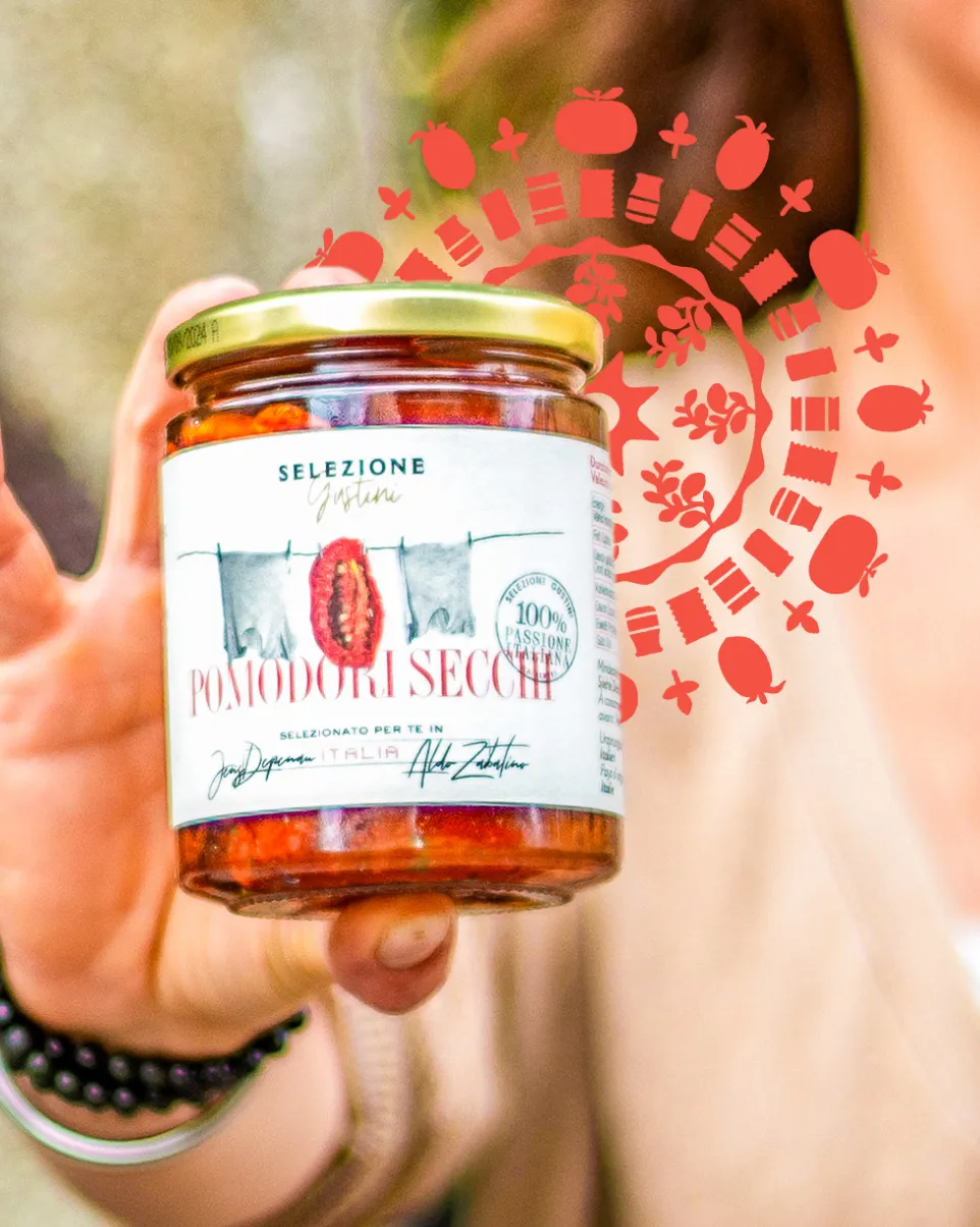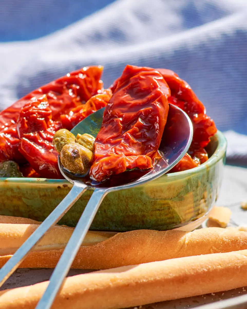 getrocknete Tomaten (60%), Sonnenblumenöl, Salz, Natives Olivenöl Extra, Weinessig, Kapern, Knoblauch, Basilikum, Petersilie. Herkunft der Tomaten: Apulien (Italien)