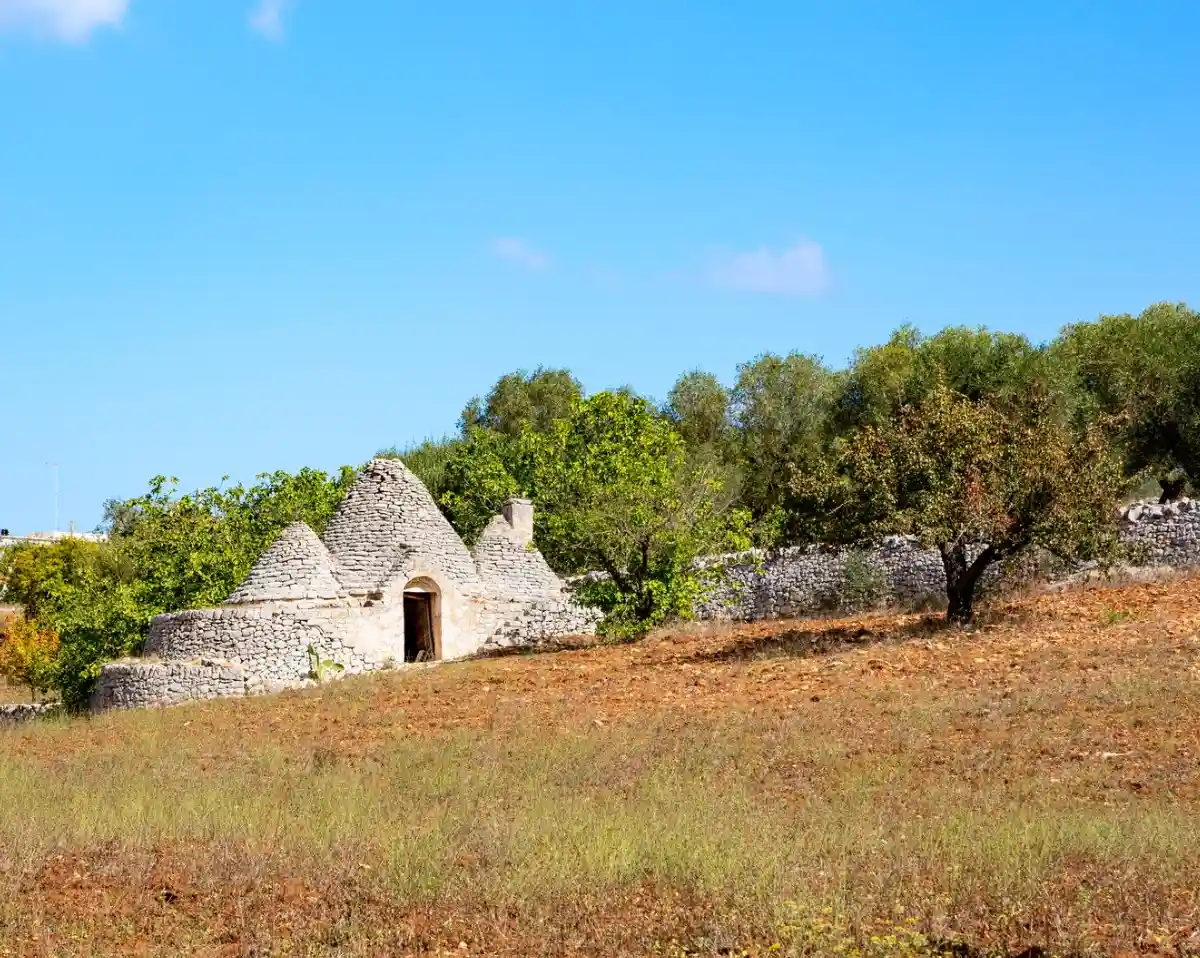 Wie weiße Zuckerhüte leuchten die Trulli. Es sind Rundhäuser aus gestapeltem Kalkstein: kühl im Sommer, warm im Winter. Auf jedem Trullo sitzt eine andere Spitze. Es sind religiöse Symbole, die das Haus beschützen sollen. Heute sind sie ein Wahrzeichen des Weinlandes Apulien.