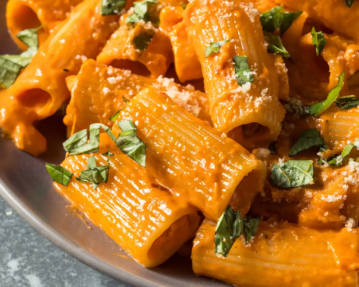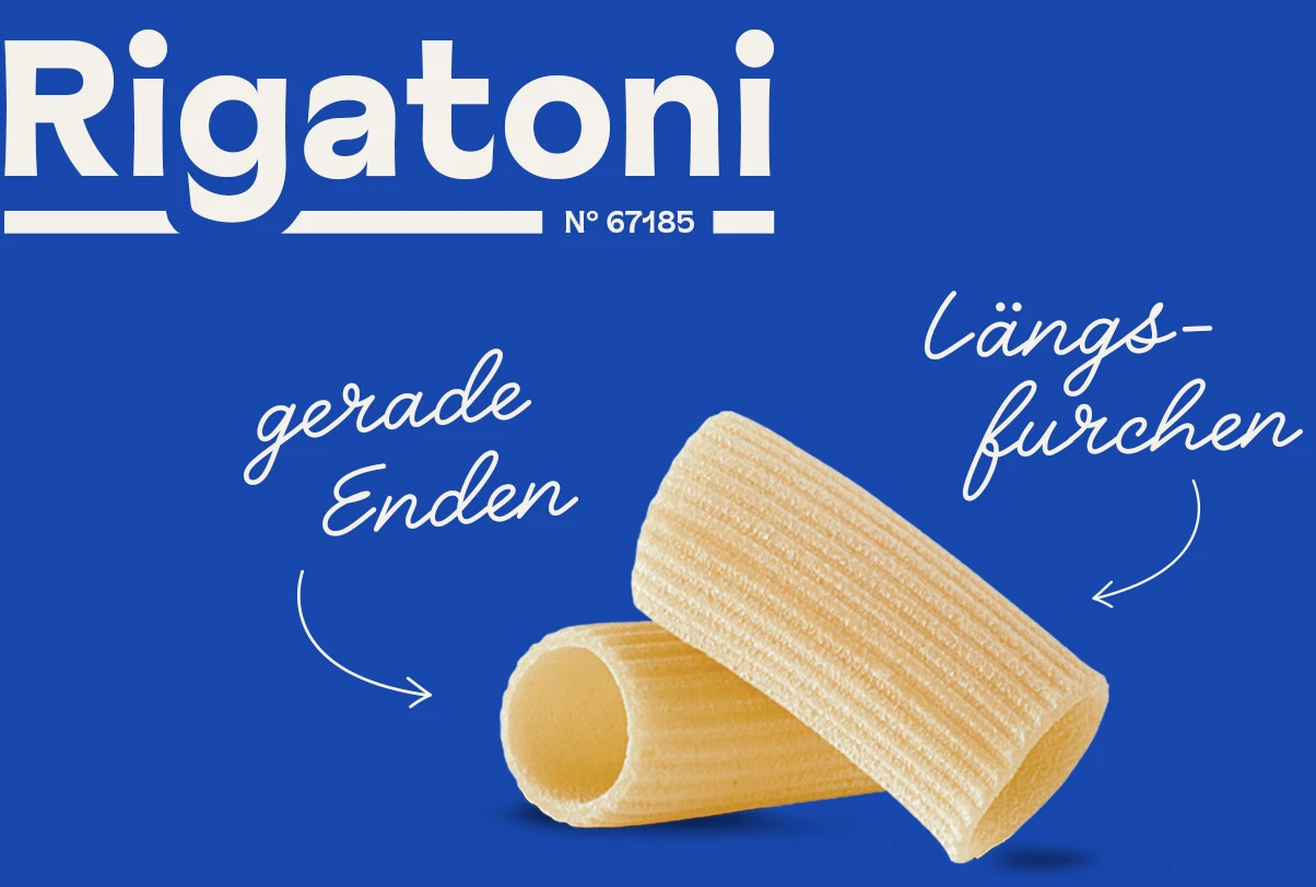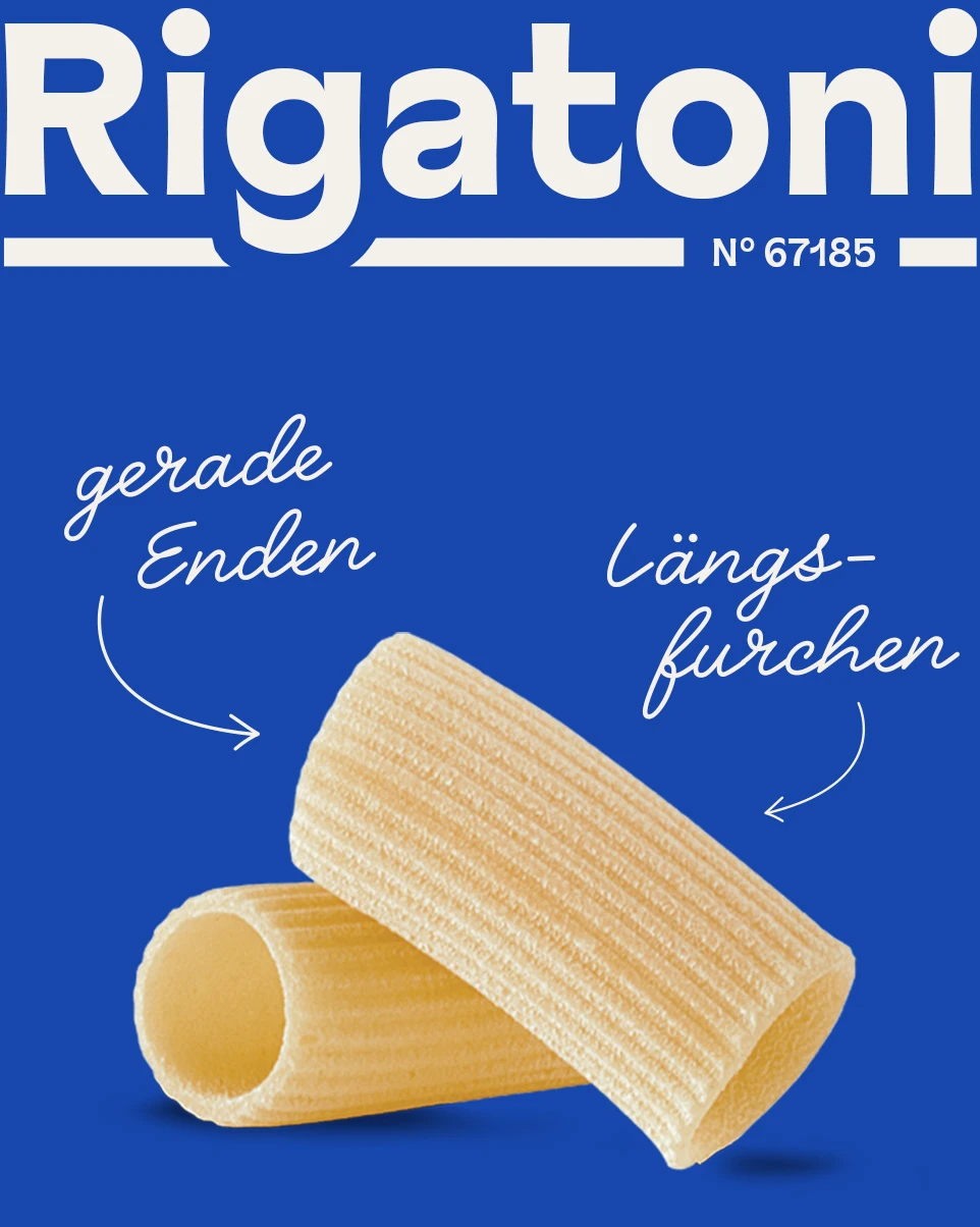 "Rigato" bedeutet im Italienischen "geriffelt". Tiefe Rillen und ein großer Hohlraum sind die Markenzeichen der Rigatoni aus einer der besten Pastamanufakturen Italiens. So können die bissfesten Nudeln extra viel Soße aufnehmen.