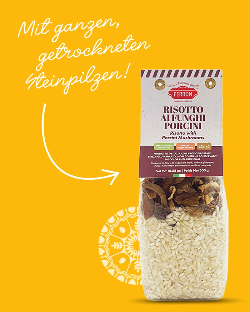 Die praktische 300-g-Packung enthält die benötigten Mengen für ein Gourmet-Steinpilzrisotto für drei Personen. Hergestellt aus hochwertigem Carnaroli-Reis und erlesenen Zutaten. Die Zubereitung ist einfach und bequem, sodass du in weniger als 20 Minuten ein echt italienisches Risotto auf dem Tisch hast.
