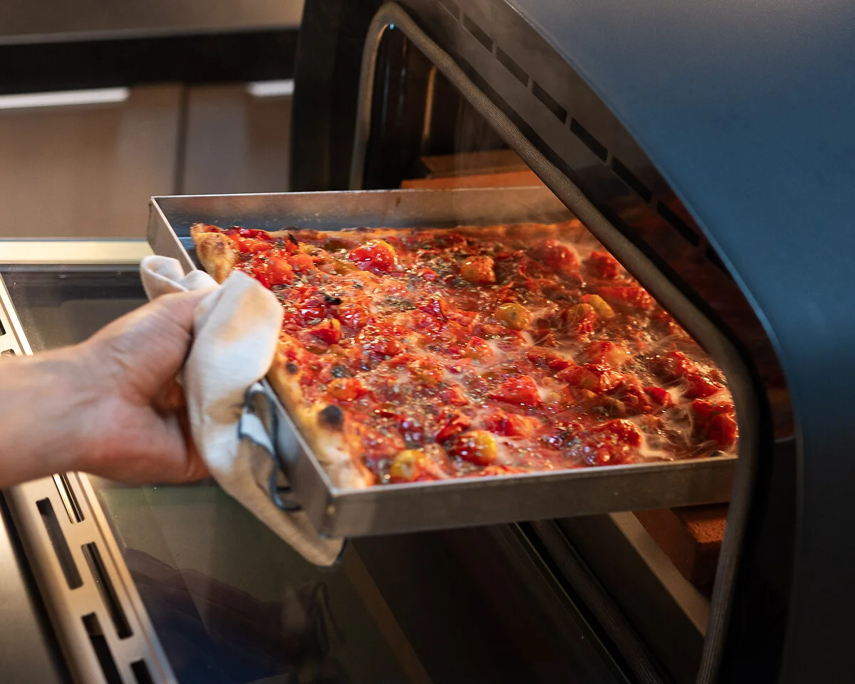Wie reinige ich den Urbe? Die Türscheiben lassen sich zur Reinigung einfach herausnehmen, die Glasscheibe ist sogar spülmaschinengeeignet. Backkammer und Stein können mittels Pyrolyse gereinigt werden – einfach den Ofen auf über 400 °C erhitzen. Speisereste zerfallen dabei zu Asche und lassen sich mühelos entfernen. Ein praktischer Tipp: Nach jeder Pizzasession den Stein umdrehen – so verbrennen die Rückstände auf der Unterseite beim nächsten Backen von selbst.
