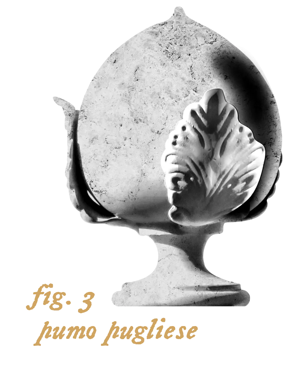 Im Weinland Apulien symbolisieren Pumi Fruchtbarkeit und Wohlstand. Pumi waren einst dem Kult der römischen Göttin Pomona gewidmet und prägen die Architektur der weiß getünchten Städte Apuliens bis heute. Man findet sie an den gusseisernen Balkonen, an Säulen, Toren oder als kleine Glücksbringer in den Wohnungen der Menschen.