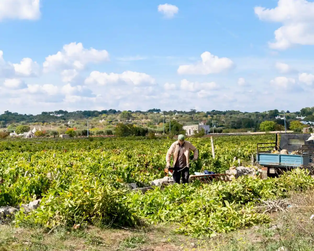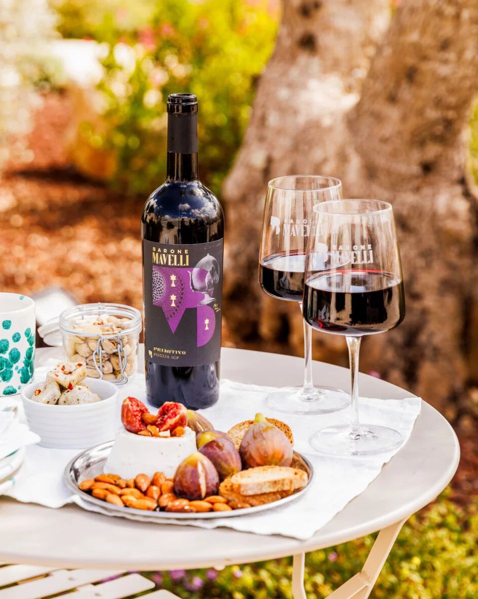 Hier tragen uralte Weinstöcke auf sanft geschwungenen Hügeln die kostbaren Trauben. Sie gedeihen auf steinigen Böden, die dem Primitivo seinen mineralischen Charakter verleihen. Verwöhnt von der vollen mediterranen Sonne, reifen die Weinbeeren zwischen Mandel- und Kirschbäumchen heran. Der Wind des Meeres streift mit seiner salzigen Prise hin und wieder ihr Blattwerk.